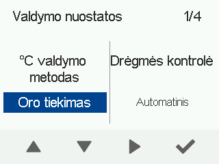 6. Naudokite rodyklių mygtukus tiekiamo oro temperatūros valdymo būdui pasirinkti.