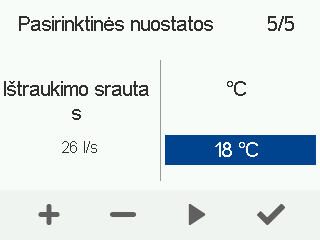 - Naudokite Plius ir Minus mygtukus tiekiamo oro temperatūrai reguliuoti. Temperatūros intervalas yra nuo +5 °C iki +25 °C.