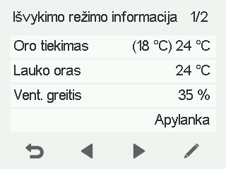 - Tiekiamas oras – rodo faktinę į butą tiekiamo oro temperatūrą ir tiekiamo oro temperatūros nustatymą (skliausteliuose), jei tiekiamas oras yra šiltesnis nei nustatyta vertė.