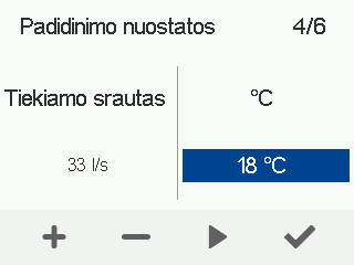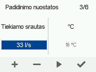 - Naudokite pliuso ir minuso mygtukus, kad nustatytumėte tikslinį tiekiamo oro srauto lygį. Ištraukiamo oro srauto lygis reguliuojamas automatiškai pagal tiekiamo oro srautą, ir naudotojui nereikia jo reguliuoti atskirai.