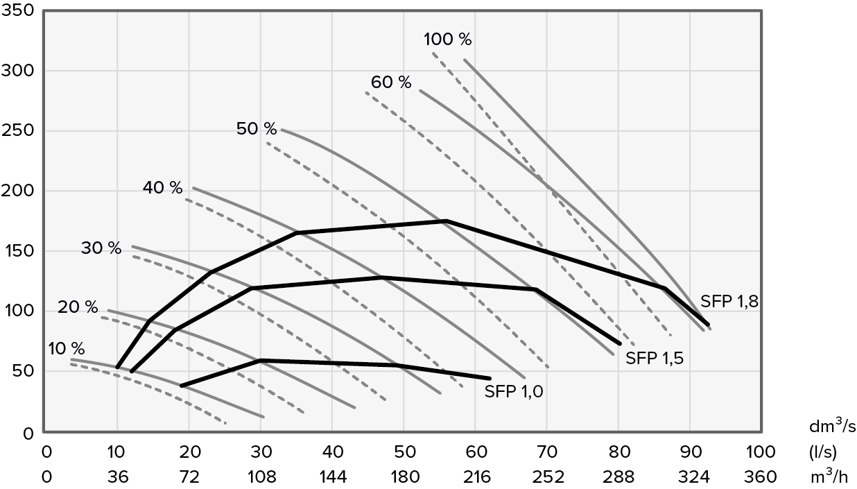 SFP greitis (specifinė ventiliatoriaus galia) rekomenduojama vertė <1.8 (kW/m3/s).