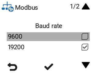 - Naudodami mygtukus Rodyklė aukštyn ir Rodyklė žemyn nustatykite „Modbus“ Sparta bod.. Galimos parinktys yra 9600, 19200, 38400, 57600 ir 115200.