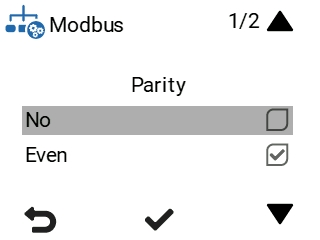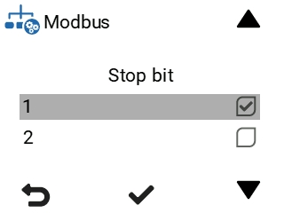 - Naudodami mygtukus Rodyklė aukštyn ir Rodyklė žemyn nustatykite „Modbus“ Stabd. bit.. Galimos parinktys yra 1 arba 2.