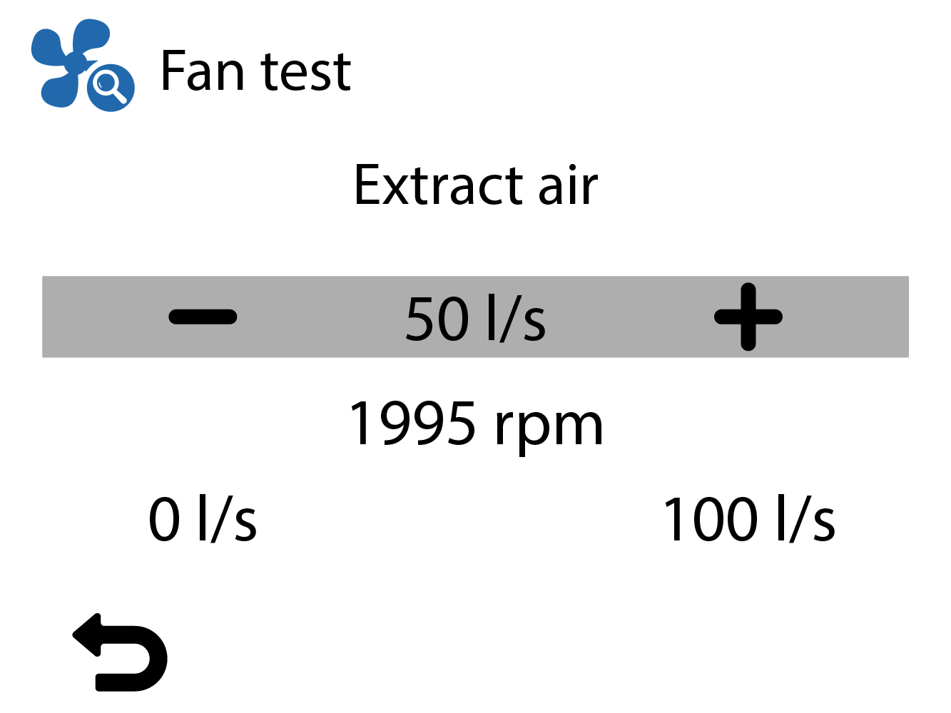 - Naudodami mygtukus Plius ir Minus reguliuokite ventiliatoriaus oro srautą (l/s arba m3 /h).Girdėsite, kaip ventiliatoriaus greitis keičiasi pagal nustatytą reikšmę. Ventiliatoriaus sukimosi greitis rodomas aps./min laukelyje.