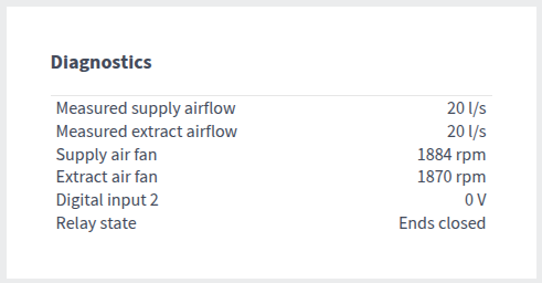 Ekran Diagnostyka umożliwia monitorowanie w czasie rzeczywistym wartości urządzenia wentylacyjnego, takich jak przepływy powietrza, prędkości wentylatora i stan wejść cyfrowych i przekaźnika.