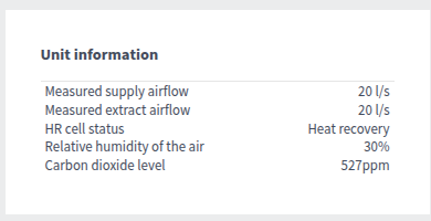 - Prędkość wentylatora — Pokazuje natężenie przepływu powietrza nawiewanego ustawiony dla urządzenia wentylacyjnego (l/s lub m3/h). Jeżeli włączone jest automatyczne zwiększanie (np. kontrola wilgotności lub dwutlenku węgla), rzeczywisty przepływ powietrza może różnić się od ustawionej wartości. Rzeczywiste natężenia przepływu powietrza nawiewanego i wywiewanego są wyświetlane oddzielnie w obszarze Informacja.