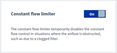 Ogranicznik stałego przepływu powietrza zawiesza normalną kontrolę wentylatora dążącą do osiągnięcia docelowego poziomu przepływu powietrza. Ogranicznik jest przeznaczony do tymczasowego użytku w celu ograniczenia prędkości wentylatora w sytuacjach, gdy na przykład zwiększona prędkość wentylatora powoduje niepokojący hałas. Użycie ogranicznika może znacznie obniżyć przepływ powietrza w systemie kanałów.