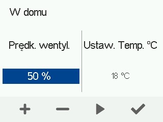 - Można dostosować prędkość wentylatora i temperaturę powietrza nawiewanego trybu W domu oraz wyłączyć kontrolę wilgotności i dwutlenku węgla.
