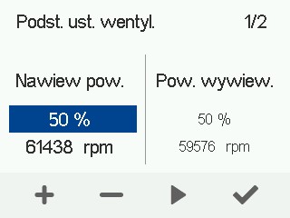 - Dostosuj zawory i ustaw takie wartości procentowe sterowania wentylatorami powietrza nawiewanego i wywiewanego, które umożliwiają przepływy powietrza trybu W domu.