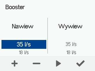 Przepływy powietrza w trybie Booster są automatycznie o 30% wyższe niż przepływy powietrza w trybie W domu, ale mogą zostać dostosowane. Inne ustawienia trybu Booster są skonfigurowane identycznie jak ustawienia trybu W domu. Dla trybu Booster można również ustawić regulację czasową.