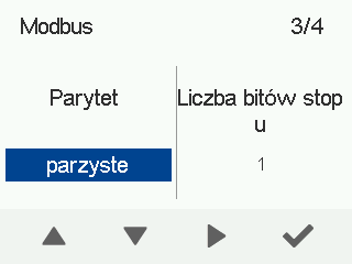 - Użyj przycisków Strzałki w górę i Strzałki w dół, aby ustawić Parzystość Modbus. Dostępne opcje to: