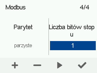 - Użyj przycisków Plus i Minus, aby ustawić Bit stopu Modbus. Dostępne opcje to 1 lub 2.
