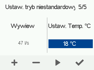 - Użyj przycisków Plus i Minus, aby ustawić wydajność powietrza nawiewanego.PORADA:Jeśli chcesz utworzyć tymczasowe wysokie ciśnienie w trybie Booster, na przykład gdy rozpalony jest kominek lub używany jest okap kuchenny, zwiększa wydajność nawiewu powietrza. Zmniejszanie wydajności wywiewu powietrza nie jest zalecane.