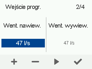 - Ustaw przepływy powietrza wentylatora nawiewnego i wywiewnego programowalnego wejścia (l/s lub m3/h).UWAGA:Przy kompensacji różnic ciśnienia różnica między przepływami powietrza nawiewanego i wywiewanego nie powinna przekraczać 30%.