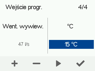 - Ustaw docelową temperaturę powietrza nawiewanego dla programowalnego wejścia. Zakres temperatury wynosi od +5°C do +25°C. Ustawienie fabryczne to 15°C.