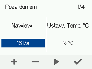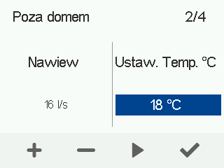 - Użyj przycisków Plus i Minus, aby ustawić docelowy poziom przepływu powietrza nawiewanego. Poziom przepływu powietrza wywiewanego jest regulowany automatycznie zgodnie z przepływem powietrza nawiewanego i użytkownik nie musi regulować go oddzielnie.