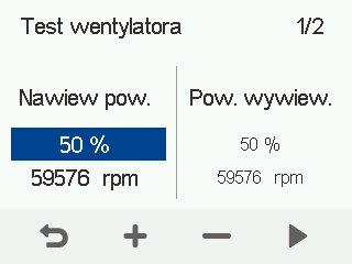 - Użyj przycisków Plus i Minus, aby ustawić ilość powietrza nawiewanego jako procent maksymalnej wydajności.Można usłyszeć, gdy prędkość wentylatora zmienia się zgodnie z ustawioną wartością. Prędkość obrotowa wentylatora jest pokazana w polu obr./min.