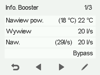 Powietrze nawiewane — wskazuje rzeczywistą temperaturę powietrza napływającego do mieszkania i ustawienie temperatury powietrza nawiewanego (w nawiasach), jeśli powietrze nawiewane jest cieplejsze niż ustawiona wartość.