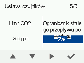 Domyślnie ogranicznik stałego przepływu powietrza jest wyłączony. Po aktywacji funkcja automatycznie monitoruje działanie urządzenia wentylacyjnego, a urządzenie działa normalnie z włączoną funkcją stałego przepływu powietrza. Jeśli wydajność wentylacji spada z powodu, na przykład, zablokowanego filtra, ogranicznik stałego przepływu powietrza zapobiega gwałtownemu wzrostowi prędkości wentylatora, aby uniknąć nadmiernego hałasu. Ikona ogranicznika w widoku głównym wskazuje, kiedy funkcja jest aktywna: