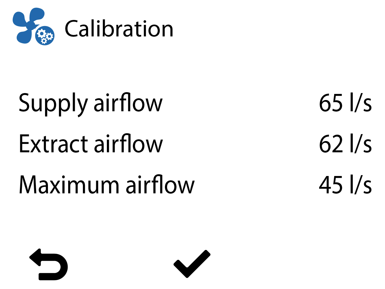 - Po kalibracji wyświetlany jest rzeczywisty maksymalny przepływ powietrza urządzenia w odniesieniu do używanych kanałów.