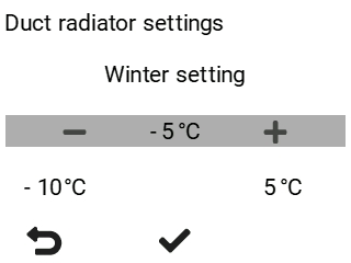 - Automatyczny — latem utrzymywana jest ustawiona temperatura powietrza nawiewanego. Zimą nagrzewnica kanałowa jest włączana, gdy temperatura powietrza zewnętrznego spada poniżej ustawienia zimowego.