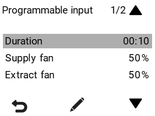 - Użyj przycisków Plus i Minus, aby ustawić wydajność wentylatora nawiewnego jako procent maksymalnej wydajności dla programowalnego wejścia.