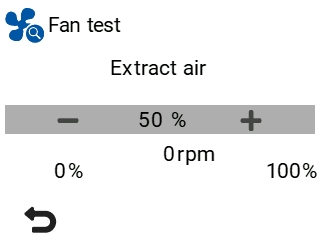- Użyj przycisków Plus i Minus, aby ustawić ilość powietrza nawiewanego jako procent maksymalnej wydajności.Można usłyszeć, gdy prędkość wentylatora zmienia się zgodnie z ustawioną wartością. Prędkość obrotowa wentylatora jest pokazana w polu rpm.