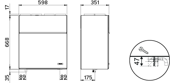 I Vallox 51K MVmonteras en vinkelkoppling i bottendelen mellan aggregatet och spiskåpan. Från vinkelkopplingen förs ett rör för kondensvatten till exempel till vattenlåset i lavoaren eller golvbrunnen. Vattenlåset får inte installeras inuti spiskåpan. Istället ska det installeras i röret för kondensvatten så att underhåll är möjligt. Det finns cirka 2 mm stora hål på baksidan av Vallox 51K MV ventilationsaggregatets botten som visar var röret för kondensvatten ska installeras.