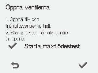 Du kan mäta ventilationsaggregatets maximala luftflöde i kanalsystemet som används. Testet tar bara en minut och är inte obligatoriskt. Om du vill hoppa över testet, välj Ångra: . Om du hoppar över testet, används standardvärdet för det maximala luftflödet.