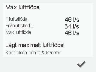 Om det maximala luftflödet är lågt, kan tillufts- eller frånluftsflödet vara blockerat. Om så är fallet ska du kontrollera om det finns tilltäppningar i ventilationsaggregatet och kanalerna.