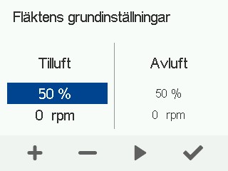 - Justera ventilerna och ställ in sådana kontrollprocentsatser på tillufts- och frånluftsfläktarna som möjliggör luftflödena i Hemma-läget.