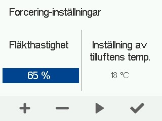 - Ställ in fläkthastigheten och tilluftstemperaturen för Forcering-läget.