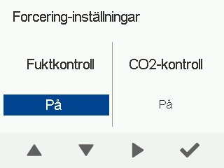 Ställ in inställningarna för fläkthastigheten, tilluftstemperaturen, koldioxid- och fuktighetskontrollen för Forcering-läget. I Forcering-läget är fläkthastigheten automatiskt 30 % högre än fläkthastigheten i Hemma-läget. Du kan justera fläkthastigheten och tilluftstemperaturen för Forcering-läget och avaktivera fuktighets- och koldioxidkontrollen. En timer kan också ställas in för Forcering-läget.