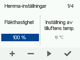 - Använd Plus och Minus-knapparna för att ställa in målet för tilluftens temperatur i det här ventilationsläget.Du kan ställa in temperaturen på mellan +5 °C och +25 °C. Den rekommenderade temperaturen är +18 °C eller 2–3 °C under rumstemperaturen.