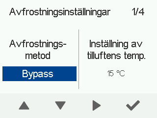 Bypass (fabriksinställning) — Värmeväxlaren kringgås på tilluftssidan. Tillufts- och frånluftsfläktarna fungerar som normalt och ventilationen är i balans under avfrostningen. Detta förhindrar drag eller luftbrott på grund av skillnader i tryck. Den här inställningen rekommeneras för välisolerade byggnader med undertryck. När bypass-funktionen används måste ventilationsaggregatets eftervärmningsmotstånd och möjliga extra värmemotstånd vara aktiverade.