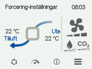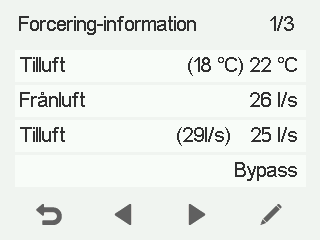 - Uteluft — Anger nuvarande frånluftsflödet (l/sek eller m³/h). Inställningen för frånluftsflödet är automatiskt fastställt på basis av tilluftsflödet och kan inte justeras av användaren.