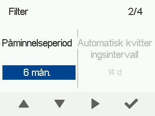 - Specialläge – Filterpåminnelsen är aktiverad och bekräftas manuellt eller automatiskt inom den tid som ställts in i fältet Automatiskt kvitteringsintervall.