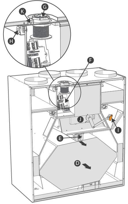 - Dra ut värmeväxlarens svarta, övre stöd (E). Lyft upp och dra ut värmeväxlaren (D).