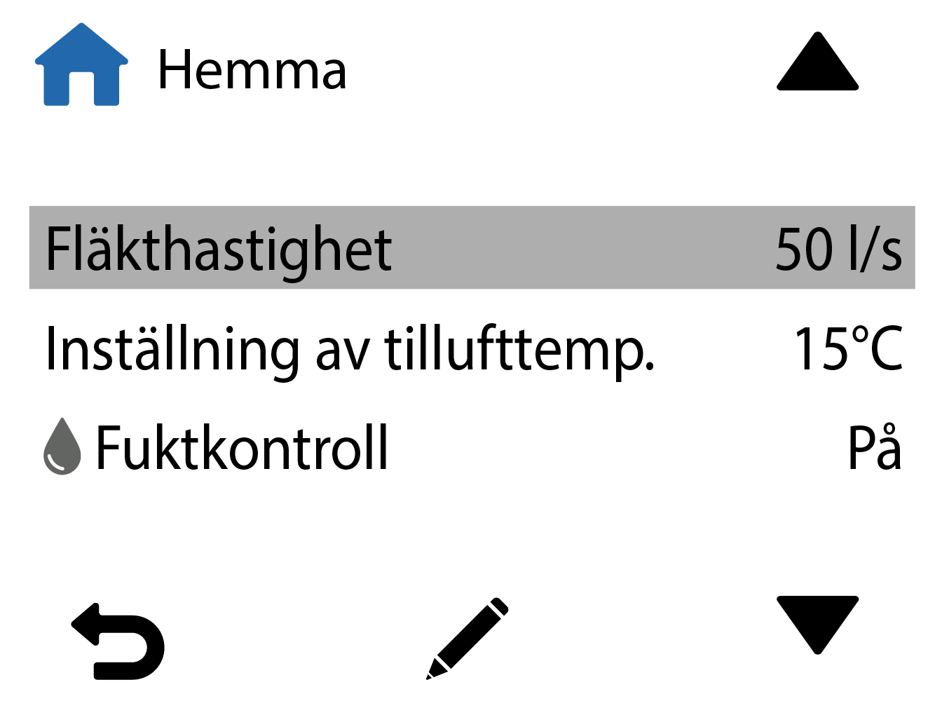 Ändra ventilationslägets inställningar Välj Inställningar för ventilationsläget i huvudmenyn. Välj det ventilationsläge som ska redigeras. Redigeringsmenyn öppnas.