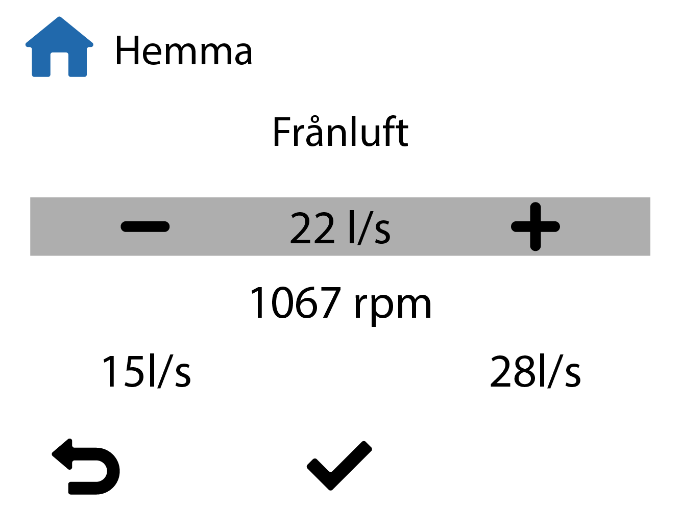 OBS:Som standard är fläkthastigheten i Hemma-läget den högre procentandelen av de grundläggande värden för ventilationens luftflöde som ställts in tidigare. Vi rekommenderar att den här grundläggande ventilationsutgången ställs in för Hemma-läget. Du kan justera utgången om det behövs.