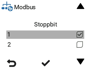 10. Använd Uppåtpilen och Neråtpilen för att ställa in Stoppbit för Modbus. Alternativen är 1 eller 2.