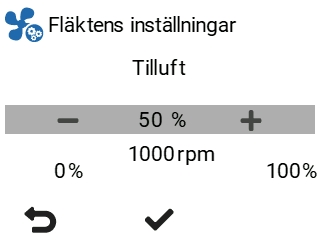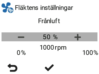 FläktinställningarStäll först in fläktens grundinställningar. Dessa justerar fläkthastigheterna i Hemma-läget.Justera ventilerna och tillufts- och frånluftsfläktarnas kontrollprocenter som upprätthåller de luftströmmar som ställts in för Hemma-läget.