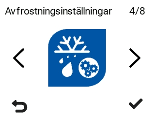 Stopp för tilluftsfläkt — Tilluftsfläkten stannar under avfrostningen. Detta orsakar ett tillfälligt undertryck i lägenheten. Denna inställning rekommenderas om inomhusluftens temperatur är ovanligt låg (<15 °C) eller om du vill minska användningen av värmemotstånd under avfrostningen.
